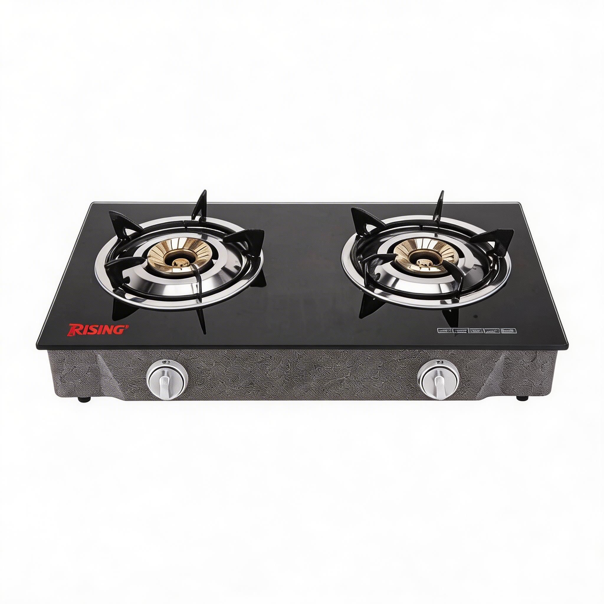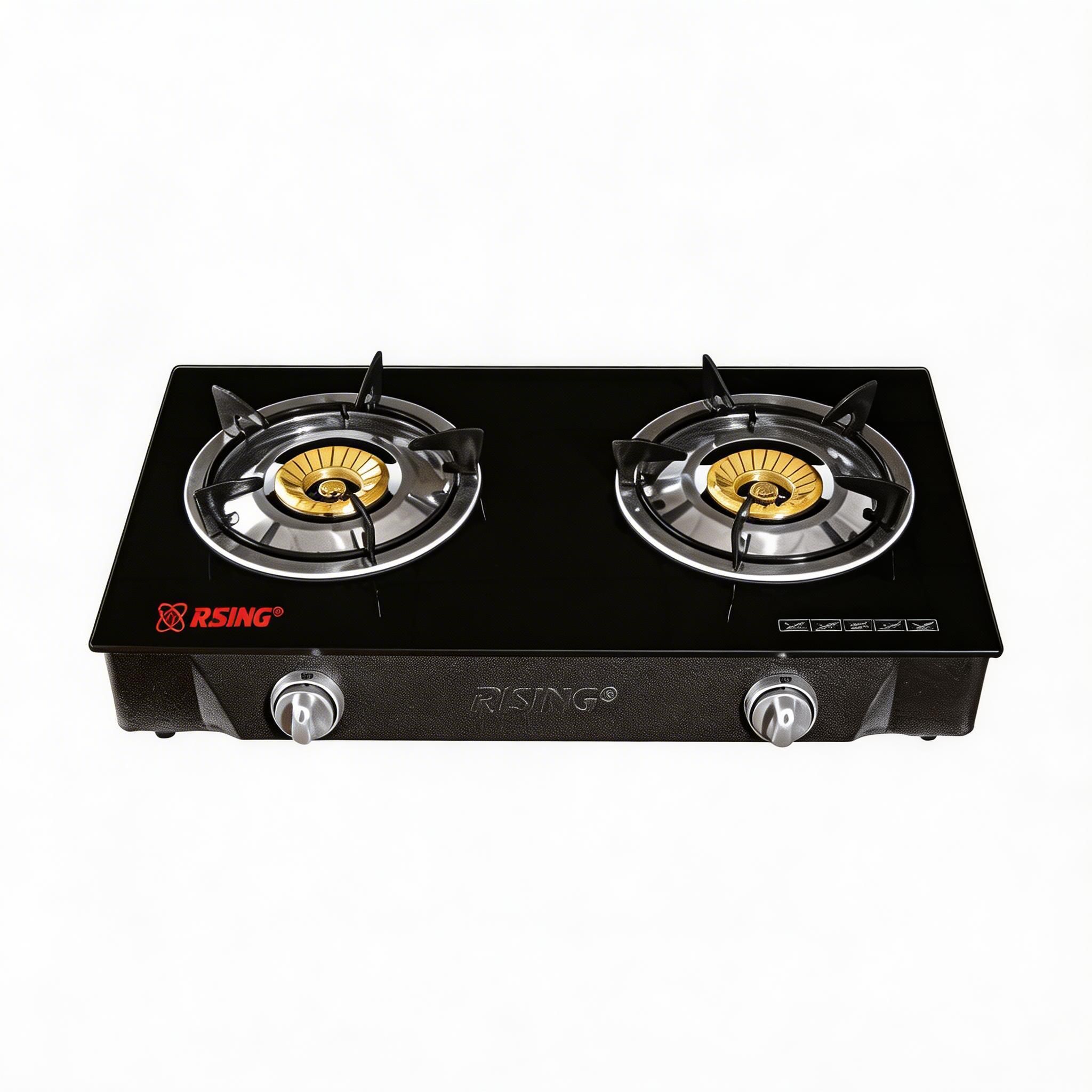 Maximize your kitchen efficiency with this double burner gas stove. The sleek glass top adds a modern touch to any kitchen while the cast iron honeycomb burner ensures even heat distribution.